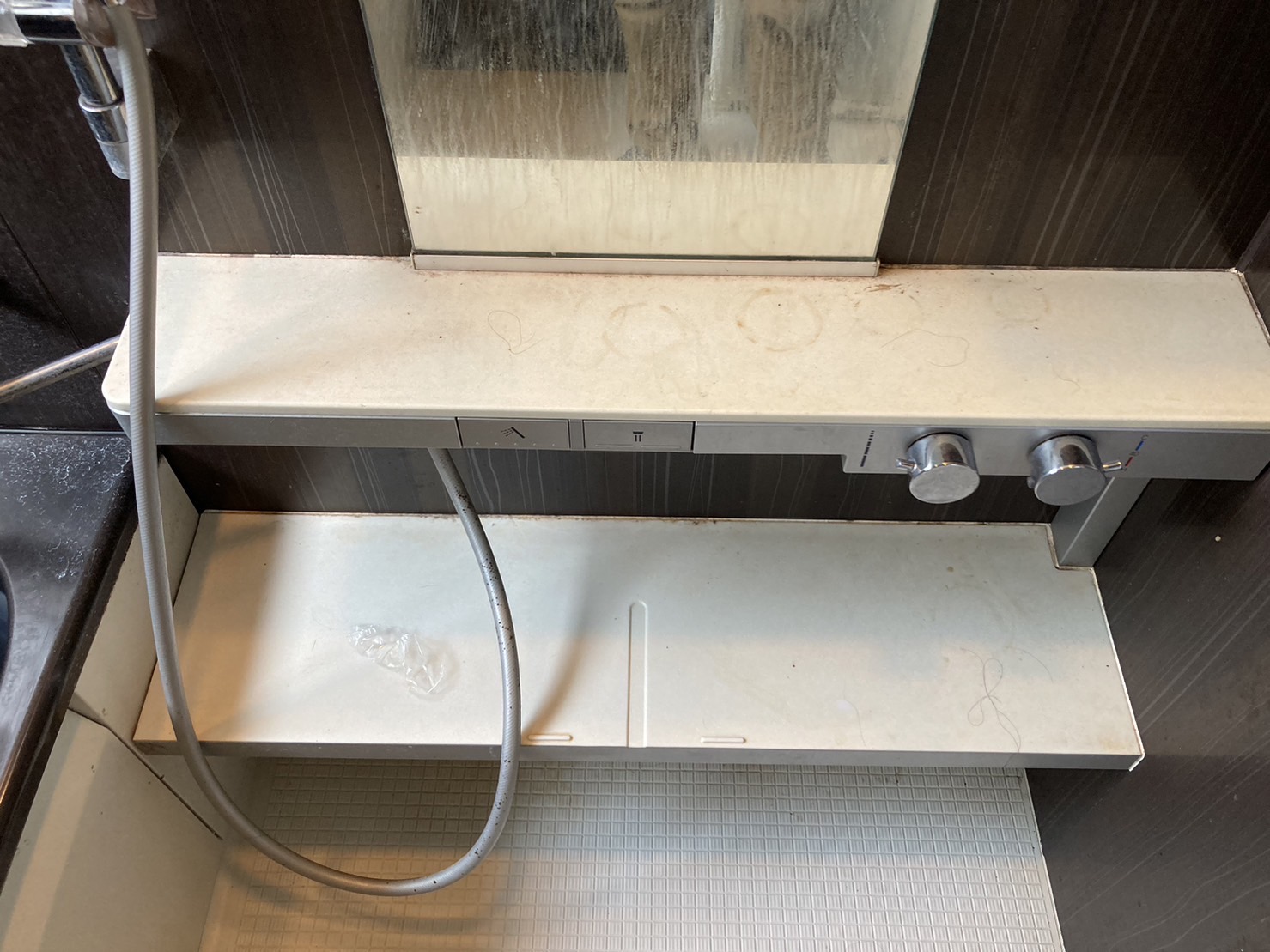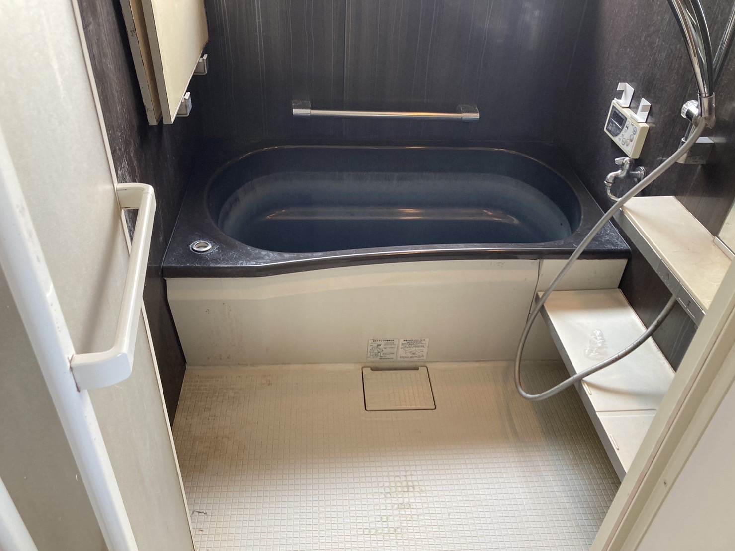 少しわかりにくいのですが、浴室の壁に縦に入っている筋状のものは元からの模様になります。